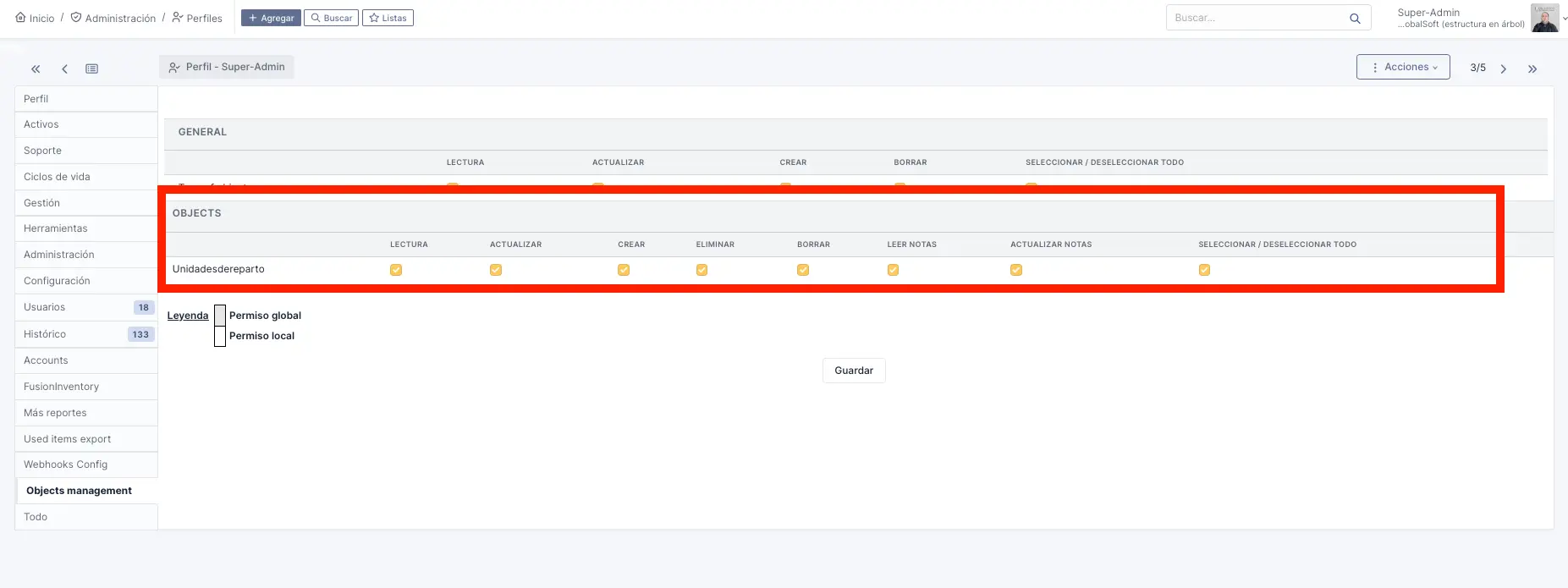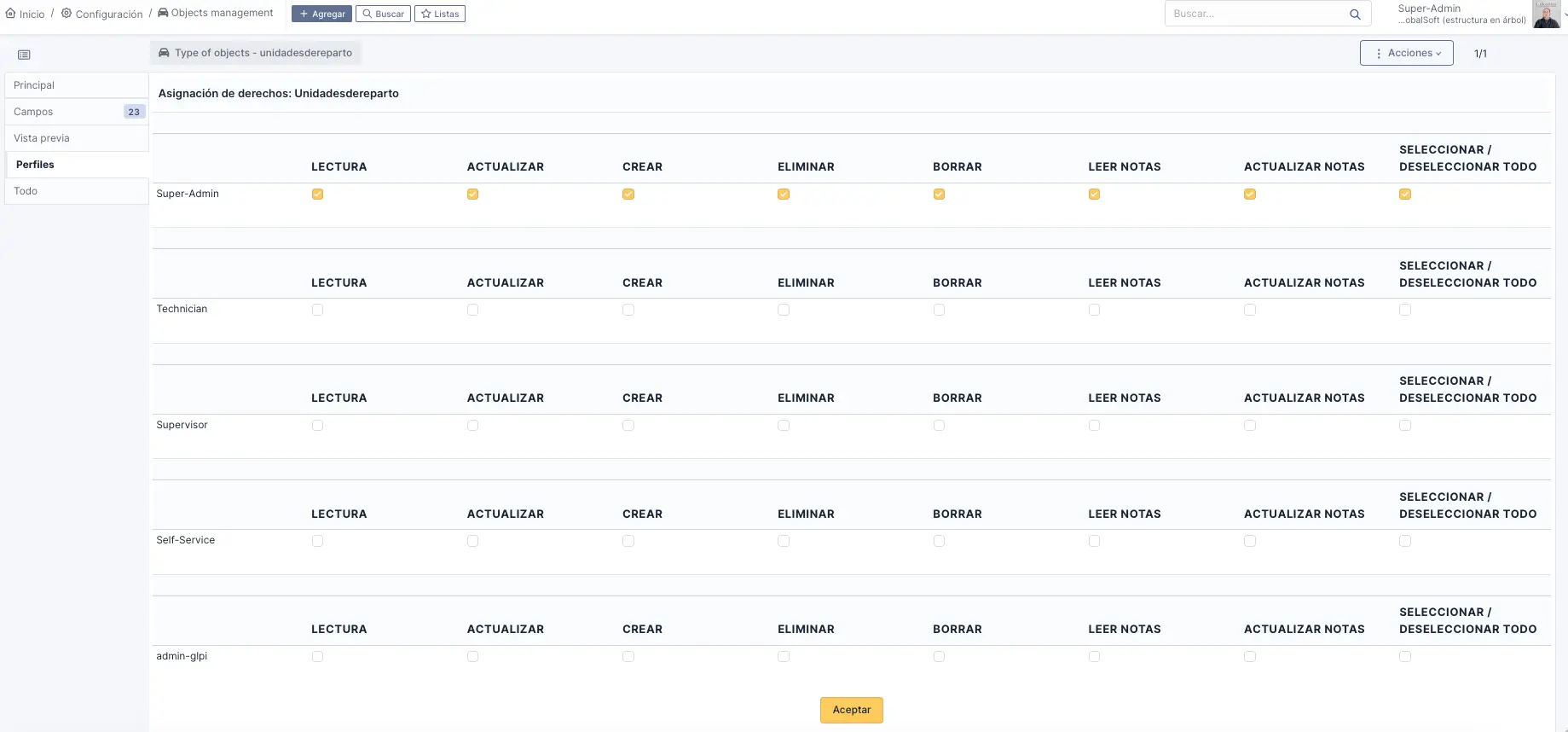 Administración → Perfiles → Super-Admin → Objetos